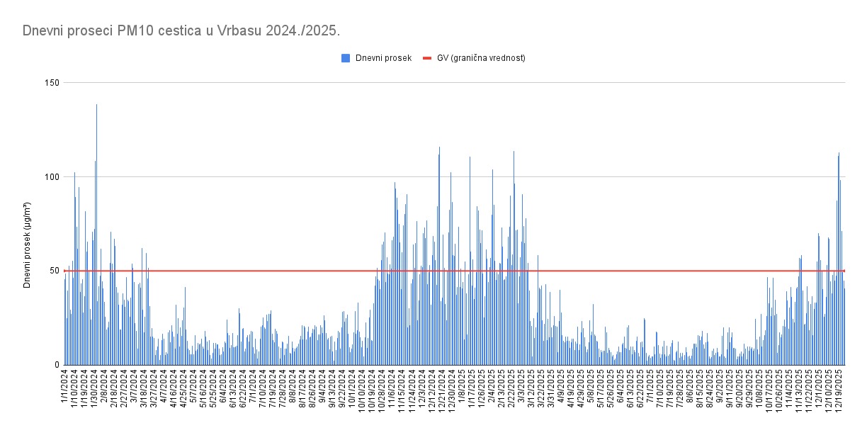 Dnevni proseci PM10 čestica u Vrbasu 2024./2025. godine